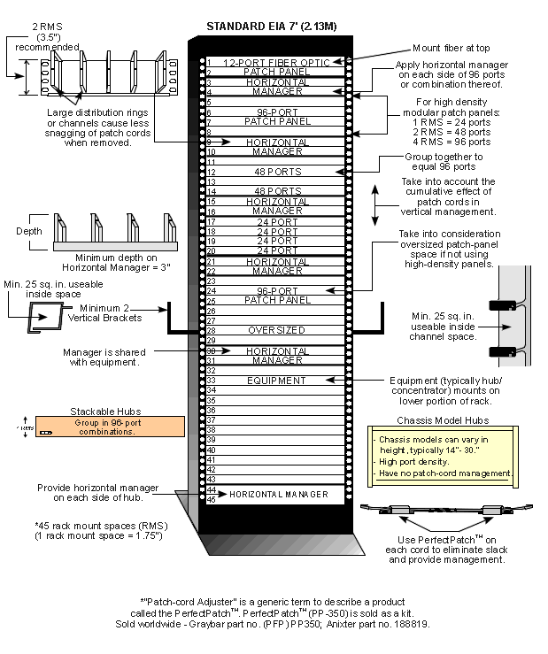 3.1) Wire manager requirements. After a review of wire managers, you must determine if additional wire managers are required for future management needs. Typically, patch panels cannot be moved because they are terminated and cables are formed in place, so you have to work around this obstacle for horizontal managers. Usually, at the top and bottom of the management system you can install horizontal managers or increase the size to larger ones due to the absence of adequate horizontal managers. The vertical managers will probably need to be replaced with a larger capacity type. Remember the key to good patch-cord management is for the patch cord to be easily accessible. The more restrictions you put on a cord the harder it is to route and trace. (See figure 1 for management tips.)