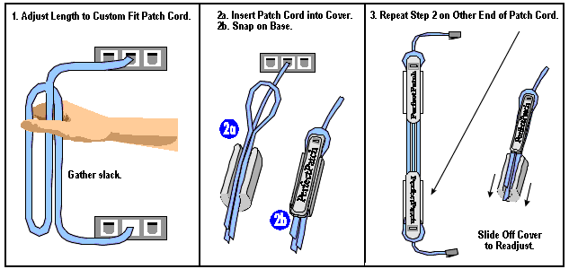 6B) Patch-cord Adjustment. Remove the PerfectPatchTM base and cover from your pouch. Clip (install) to a patch cord. Adjust the patch cord to the length required for that patch, then clip on another base and cover. This only takes a few seconds but is necessary to prevent future maintenance problems (See figure 2).