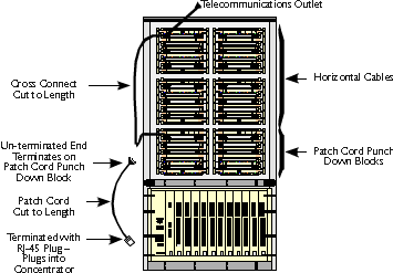 This has lead patch-cord users to cast about for other solutions to these problems. One alternative that some firms are using is to terminate one end of the patch cord on a punchdown block, while the other end is terminated in the traditional way, with a connector that fits into the equipment (concentrator). The patch cord punchdown block connects to the horizontal cabling system through a crossconnect field. Creating such a crossconnect field permits you to cut your patch cords to the proper length for each connection (see figure 16).