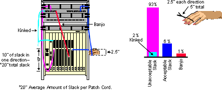 However, bend-radius problems were not as prevalent as those encountered in horizontal management systems, although 32 cases of kinking were recorded. This was because of the great accumulation of slack that had built up over time in vertical systems, along with the entangling effect described above. Also, vertical systems were more likely to have patch cords tightly crammed into them, creating a situation best described as "overfilling."