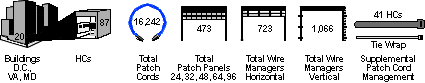During the study, the Concert Technologies inspection team examined 473 patch panels in 87 wiring closets. In all, 16,242 patch cords were inspected, along with 723 horizontal patch-cord managers and 1066 vertical managers. Hook-and-loop (or Velcro(r)) and tie-wrap devices, used in 41 of the closets, were classified as to the horizontal and vertical systems with which they were used (see figure 3).