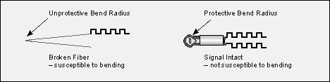 PROTECTIVE BEND RADIUS AND BEND-RADIUS STABILITYWhen fiber patch cord is kinked (unlike the copper patch cords which just may suffer signal degradation), fiber is not as forgiving - it breaks. That is why you must protect it at all times from being susceptible to breakage.